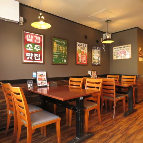 【ご家族連れも安心のゆったりテーブル席】幅広いシーンでご利用いただけるよう、ゆったりとしたテーブル席を完備しております。お子様連れのご家族でのお食事や、ママ会、大人数での各種ご宴会にもしっかりと対応可能。リラックスして自慢の韓国グルメをお楽しみいただけます。